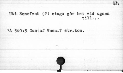 //// kra //// Uti Senefvsö (?) stuga går het vid ugnen //// till... //// ^A 540:3 Gustaf Wasa.7 str.kom. //// T---I---1 ////