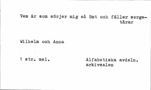 //// Vem är som sörjer mig så ömt och fäller sorgetårar //// Wilhelm och Anna //// 1 str. mel. Alfabetiska avdeln. //// arkivsalen ////