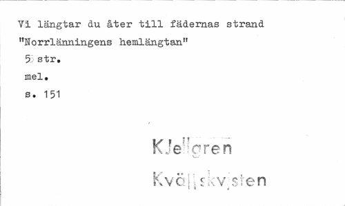 //// Vi längtar du åter till fädernas strand "Norrlänningens hemlängtan" 5 str. mel. s. 151 //// V } *' ~ //// KJe:?gren //// Kvä|-sky sten ////