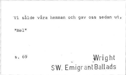 //// Vi sålde våra hemman och gav oss sedan ut, "Mel" //// s- 69 Wright //// SW. EmigrantBallads ////