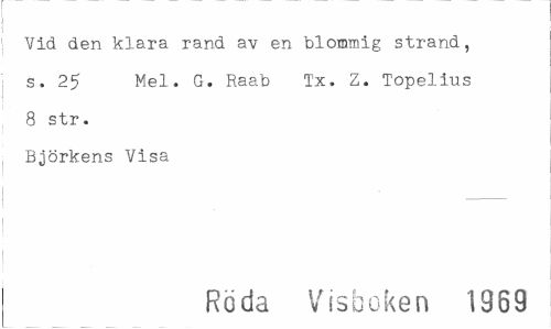 //// Vid den klara rand av en blommig strand, s. 25 Mel. G. Raab Tx. Z. Topelius 8 str. //// Björkens Visa //// Röda Visboken 1369 ////