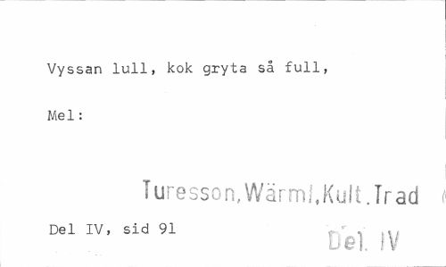 //// Vyssan lull, kok gryta så full, Mel: //// Turesson, Wärml,Kult.Trad //// Del IV, sid 91 ? ' , m //// Del. !V ////