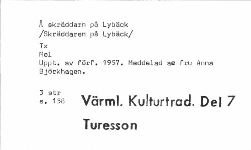 //// Å skräddarn på Lybäck /Skräddaren på Lybäck/ //// Tx Mel //// Uppt. av förf. 1957. Meddelad ao fru Anna Björkhagen. //// 3 S13C //// s. 158 Vörml. Kulturtrad. Del 7 Turesson ////