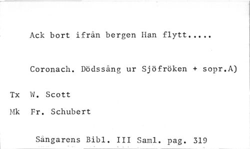 //// Ack bort ifrän bergen Han flytt //// Coronach. Dödssång ur Sjöfröken + sopr.A) //// Tx W. Scott //// Mk Fr. Schubert //// Sangarens Bibl. III Saml. pag. 319 ////