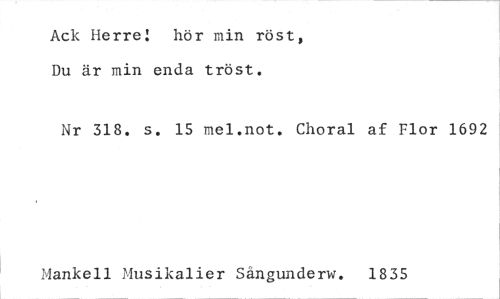 //// Ack Herre! hör min röst, Du är min enda tröst. //// Nr 318. s. 15 mel.not. Choral af Flor 1692 //// Manken_ Musikalier Sångunderw. 1835 ////