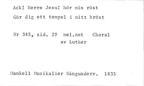 //// Ack! Herre Jesu! hör min röst Gör dig ett tempel i mitt bröst //// Nr 345, sid. 29 mel.not Choral //// av Luther //// Manken Musikalier Sångunderv. 1835 ////