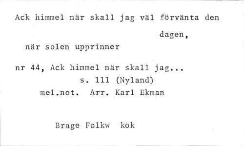 //// Ack himmel när skall jag väl förvänta den //// dagen, //// när solen upprinner //// nr 44, Ack himmel när skall jag... //// s. 111 (Nyland) mel.not. Arr. Karl Ekman //// Brage Folkw kök ////