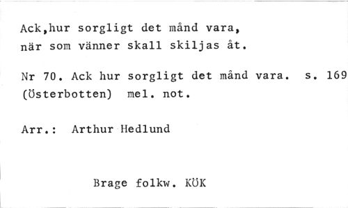 //// Ack,hur sorgligt det månd vara, när som vänner skall skiljas åt. //// Nr 70. Ack hur sorgligt det månd vara. s. 169 (Österbotten) mel. not. //// Arr.: Arthur Hedlund //// Brage folkw. KÖK ////