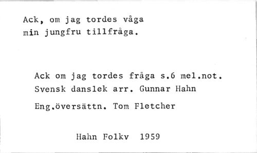 //// Ack, om jag tordes våga min jungfru tillfråga. //// Ack om jag tordes fråga s.6 mel.not. Svensk danslek arr. Gunnar Hahn //// Eng.översättn. Tom Fletcher //// Hahn Folkv 1959 ////