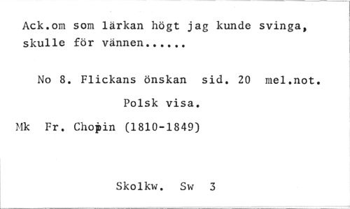 //// Acksom som lärkan högt jag kunde svinga, //// skulle för vännen //// No 8. Flickans önskan sid. 20 mel.not. Polsk visa. //// Hk Fr. Chopin (1810-1849) //// Skolkw. Sw 3 ////
