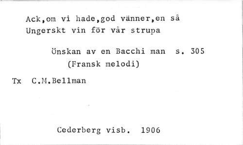 //// Ack,om vi hade,god vänner,en så Ungerskt vin för vår strupa //// önskan av en Bacchi man s. 305 (Fransk melodi) //// Tx C.M.Bellman //// Cederberg visb. 1906 ////