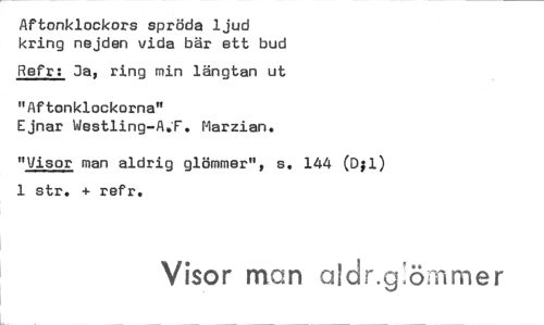 //// Aftonklockors spröda ljud kring nejden vida bär ett bud //// Refr: Ja, ring min längtan ut //// "Aftonklockorna" //// Ejnar Westling-AJ. Marzian. //// "Visor man aldrig glömmer", s. 144 (Dg) 1 str. + ref r. //// Visor man slidr.g:ö,mmer ////