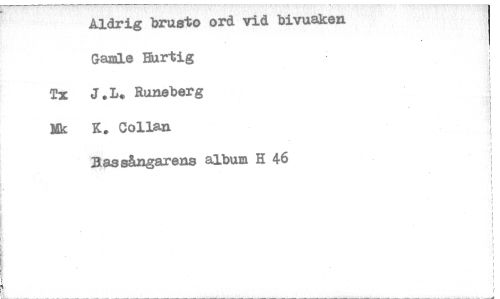 //// Aldrig brutit° ord vid bivuaken //// Gamle Hurtig //// Tx J.L. Runeberg //// Nk K. Lollan //// Bassångarens album H 46 ////