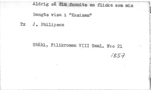 //// Aldrig så fia, funnits en flicka som min Bengts visa i "Kusinen" Tx .J. Philipson //// Ståhl, Filikromen VIII Saml. N:o 21 //// /85-7 ////