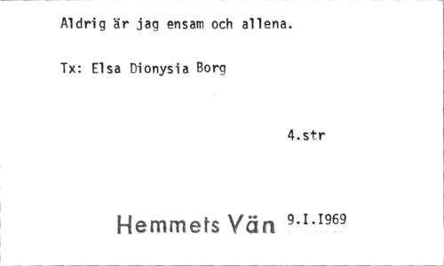 //// Aldrig är jag ensam och allena. Tx: Elsa Dionysia Borg //// 4.str //// Hemmets Vän 9."969 ////