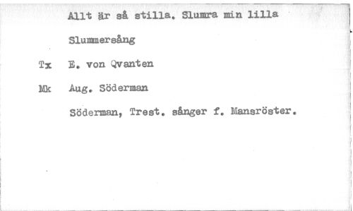 //// Allt är så stilla. Slumra min lilla //// Slummersång //// Tx B. von Qvanten //// 1k Aug. Söderman //// Söderman, Trast. sånger f. Mansröster. ////