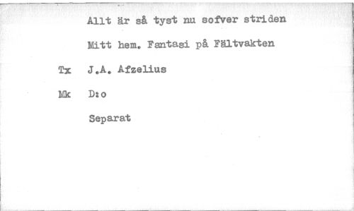 //// Allt är så tyst nu sofver striden Mitt hem. Fantasi på Fältvakten Tx J.A. Afzelius //// Mk Dzo //// Separat ////