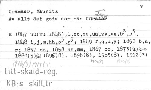 //// Cramaer, Mauritz //// Av allt det goda som man föra-tår //// E 1847 uu(nu 1848) 1848 i,j,m,hh,o3 //// r; 1857 cc, 1858 //// 188o(5) 1896(8) //// titt-skald r //// K E3-:-s -§kiltfr //// , 1 ,cc ,ss ,uu,vv,xx ,b3 ,c3 , //// ,g3; 1849 f,q,uly; 1850 b,n, //// hh,mm, 1867 00, 1873(444-v //// 1898(8), 19o3(8), 1912(7) //// 004) ////