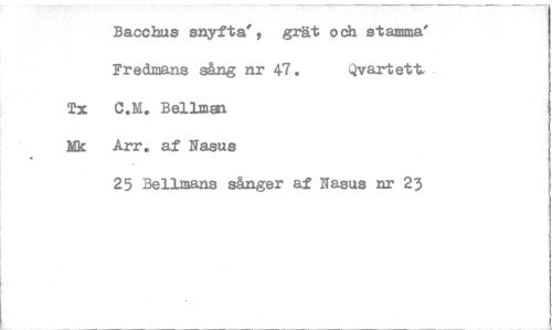 //// Bacchus snyfta', grät och stamma' //// Fredmans sång nr 47. 4vartett., //// Tx C.M. Bellman //// Mk Arr. af Nasus //// 25 Bellmans sånger af Nasus nr 23 ////