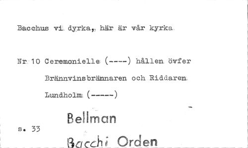 //// Bacchus vi_ dyrkar bär är vår kyrka„. //// Nr_ 10 Ceremonielle (----) hållen övfer Brännv brännaren och Riddareni Lundhol knt ( //// s. 33 Beiiman //// Bo cch Orden //// ) ////