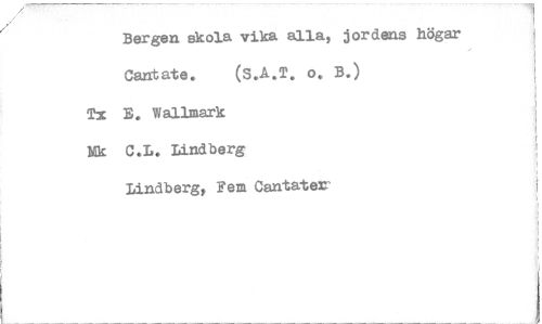//// Bergen skola vika alla, jordens högar //// Cantate. o. B.) //// Tx B. Wallmark //// Mk C.L. Lindberg //// Lindberg, Fem Cantater ////