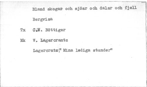 //// Bland Skogar och sjöar och dalar och fjell //// Bergvisa //// Tx OJ. Böttiger //// Ek W. Lagercrantz //// LagercrateMina lediga stunder" ////