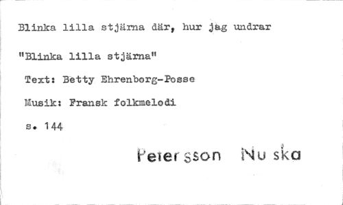 //// Blinka lilla stjärna där, hur jag undrar //// "Blinka lilla stjärna" //// Text: Betty Ehrenborg-Posse Musik: Fransk folkmelodi s. 144 //// Ce er sson Nu ska ////