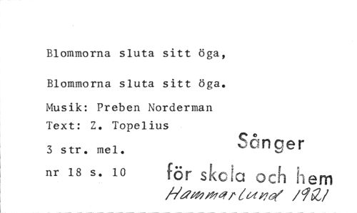 //// Blommorna sluta sitt öga, Blommorna sluta sitt öga. Sånger //// Musik: Preben Norderman Text: Z. Topelius //// 3 str. mel. //// nr 18 s. 10 för skela och hem //// 1-7/d04~/~ /92 //// /