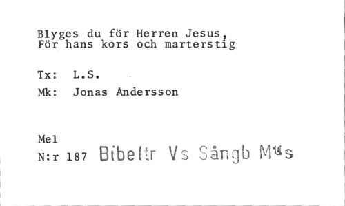 //// Blyges du för Herren Jesus, För hans kors och marterstig //// Tx: L.S. //// Mk: Jonas Andersson //// Mel //// N:r 187 Bibettr Vs Sårigb Mus ////