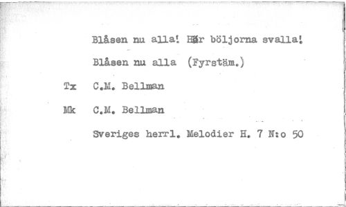 //// Blåsen nu alla: Här böljorna svalla: //// Blåsen nu alla (Fyrstäm.) //// Ta C.M. Bellman //// Nk C.M. Bellman //// Sveriges herrl. Melodier H. 7 Nto 50 ////