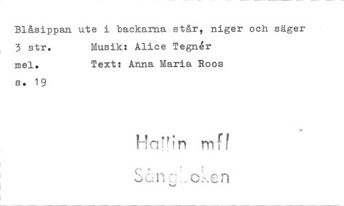 //// Blåsippan ute i backarna står, niger och säger //// 3 str. mel. s. 19 Musik: Alice Tegner Text: Anna Maria Roos //// Har!;n m I //// e //// o en ////