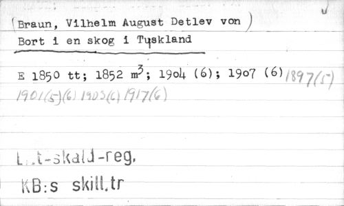 //// ti //// (Braun, Vilhelm August Detlev von ) Bort i en skog i Tliskland //// E 1850 tt; 1852 m3; 1904 (6); 19o7 (6),89-7/47 //// ___41374--y4 v 4171(e j //// .e-skati-reg, //// KB:s skilt, tr ////