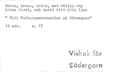 //// Brinn, brasa, brinn, mot vårlig sky brinn klart, och sprid ditt röda ljus //// It Till Valborgsmässoelden på Södergarn" //// 12 str. s. 17 //// Visbok för //// Södergarn ////
