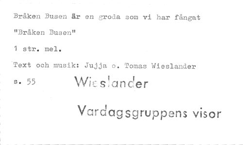 //// Bråken Busen år en groda som vi har fångat "Bråken Busen" //// 1 str. me]. //// Text och musik: Jujja o. Tomas Wieslander //// s. 55s!ander //// Vcrdagsgrupp3ns visor ////