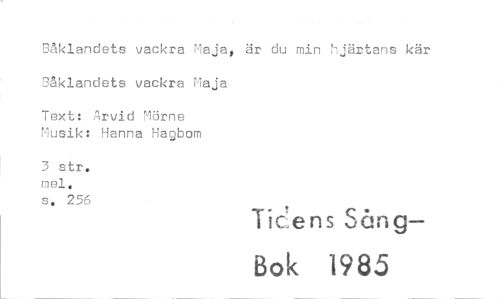 //// !3åklandets vackra Maja, är du min hjärtans kär nklandets vackra Maja //// Text: Arvid "Törne Musik: Hanna Hagbom //// 3 str. mol. Ti'.ens Så //// s. 256 c ng— //// Bok 1985 ////