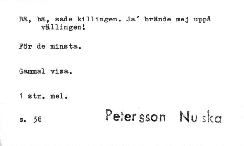 //// Bä, bä, sade killingen. Ja' brände mej uppå vällingen: //// För de minsta. Gammal visa. 1 str, mel. //// s. 38 Petersson N u s14-,a ////