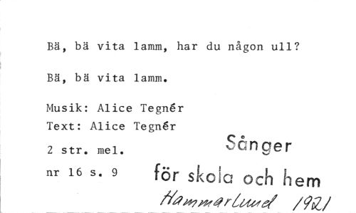 //// Bä, bä vita lamm, har du någon ull? Bä, bä vita lamm. //// Musik: Alice Tegnér Text: Alice Tegnér //// 2 str. mel. Sånger //// nr 16 s. 9 för skola och hem //// 4%5;?»,4r/beptet /92 //// /