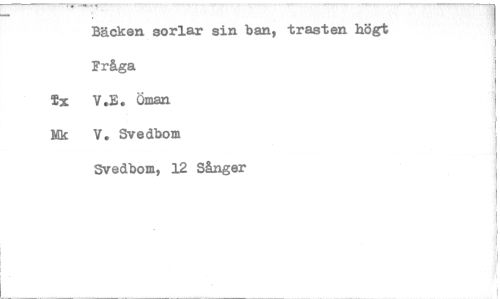 //// Bäcken sorlar sin ban, trasten högt //// Fråga //// tx V.B. Öman //// Mk V. Svedbom //// Svedbom, 12 Sånger ////