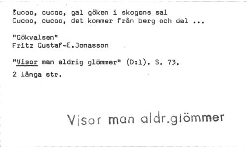 //// lucoo, cucoo, gal göken i skogens sal //// Cucoo, cucoo, det kommer från berg och dal ... //// "Gökvalsen" //// Fritz Gustaf-E.3onasson //// "Visor man aldrig glömmer" (D:1). S. 73. 2 långa str. //// Visor man aidr.giörnmer ////
