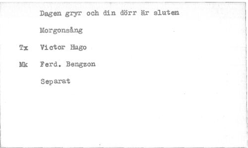 //// Dagen gryr och din dörr är sluten //// Morgonsång //// Tx Victor Hugo //// Mk Ferd. Bengzon //// Separat ////