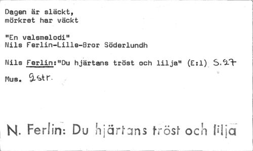 //// Dagen är släckt, mörkret har väckt //// "En valsmelodi" //// Nils Ferlin-Lille-Bror Söderlundh //// Nils Ferlin:"Du hjärtans tröst och lilja" (E:1) 5.9-3" Mus. 9.str. //// N. Ferlin: Du hjärtans tröst och fiflc ////