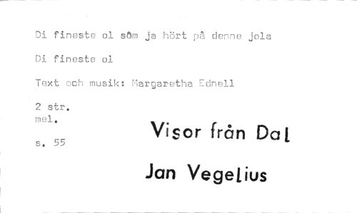 //// Di fineste ol söm ja hört på denne jola Di fineste ol //// Text och musik: Margaretha Ednell //// 2 str. mel. Visor från Dat //// s. 55 Jan Vegelius ////
