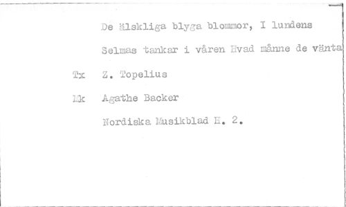 //// De älskliga blya blommor, I lundens Selmas -tankar i våren Lvad 14inne de värrbt.--1, TX Z. Topelius //// .A.gathe Backer //// Nordiska kusikblad E. 2, ////