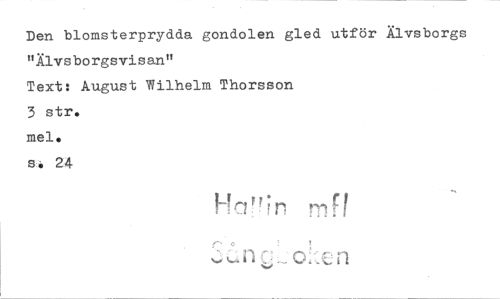 //// Den blomsterprydda gondolen gled utför Älvsborgs //// "Älvsborgsvisan" //// Text: August Wilhelm Thorsson //// 3 str. //// mol. //// so 24 //// 1-4aun mfl //// r //// %.! Ä11 0A; n ////