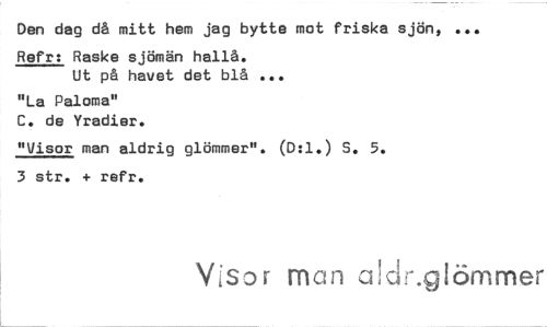 //// Den dag då mitt hem jag bytte mot friska sjön, //// Refr: Raske sjömän hallå. //// Ut på havet det blå ... //// "La Paloma" //// C. de Yradier. //// "Visor man aldrig glömmer". (D:1.) S. 5. 3 str. + refr. //// Visor man akir iömmer ////