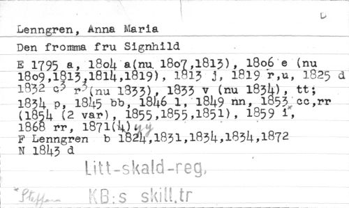 //// Lenngren, Anna Maria Den fromma fru Signhild //// E 1795 a, 190)4 a(nu. 18o7,1813), 1806 e (nu 18o9,1813 1814,1819), 1913 j, 1819 r,u, 1825 d 1832 c3 r3(nu 1833), 1833 v (nu 1834) tt; 1834 p, 18)45 bb, 1846 1 , 18)49 nn, 1 53xcc,rr (1854 (2 var), 1855,1855,1851), 1859 1; 1868 rr, 1871(Ati ; //// F Lenngren b 1 24,1831,1834,1834,1872 N 1843 d //// Litt-skald-reg, //// KO:s skilUr ////