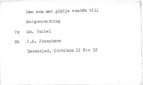 //// Den som med glädje vandla vill //// Morgonvandring //// Tx Em. Geibel //// Ek J.A. Josephson //// Hedenblad, Köralbum II N:o 12 ////