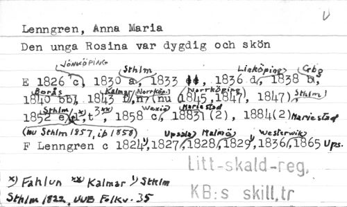 //// Lenngren, Anna Maria //// Den unga Rosina var dygdig och skön //// ..M"fii //// Sthlm. ts_Crbs, //// E 1826 c 1830 , 833 44, 1836 dc-U-338 iåej45% 18 3 /,17"ttig 0/}5k,Mr?), 18147 )24--i& 180kieni 13-5;t399, 1858'"Crigitiffirg) , 1884( 2)Nrieusaqo //// (bu Sthirn 12s7, ii, /'Si) 111.»11)K&M>o Nvester.hk, //// F Lenngren c 182491827, 8284829'',18361, Ups. //// litt-skald-reg, //// B:s skilt tr //// JIÅhlvh '4) Kalmar .3) Sikhs, //// 5thiss ILL 005 35 ////