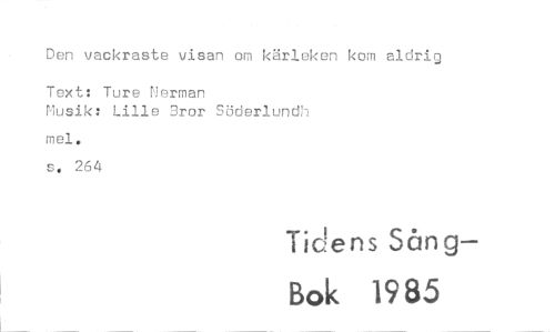 //// Den vackraste visan om kärleken kom aldrig //// Text: Ture Nerman //// Musik: Lille 3ror Söderlund;; //// mel. //// s. 264 //// Tidens Sång- //// Bok 1985 ////
