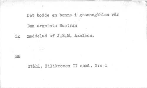//// Det bodde en bonne i grannegåblen vår Den argsinta Hustrun //// Tx meddelad af J.E.M. Axelson. //// 38k //// Filikromen II eaml. N:o 1 ////